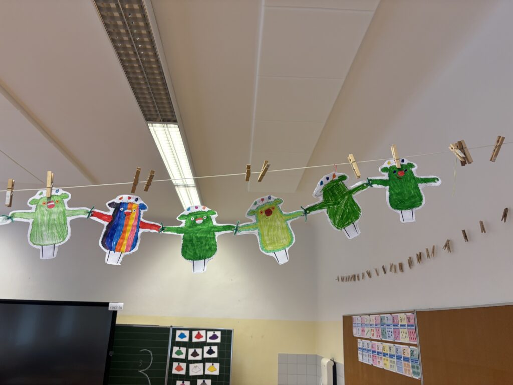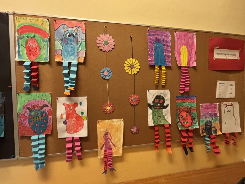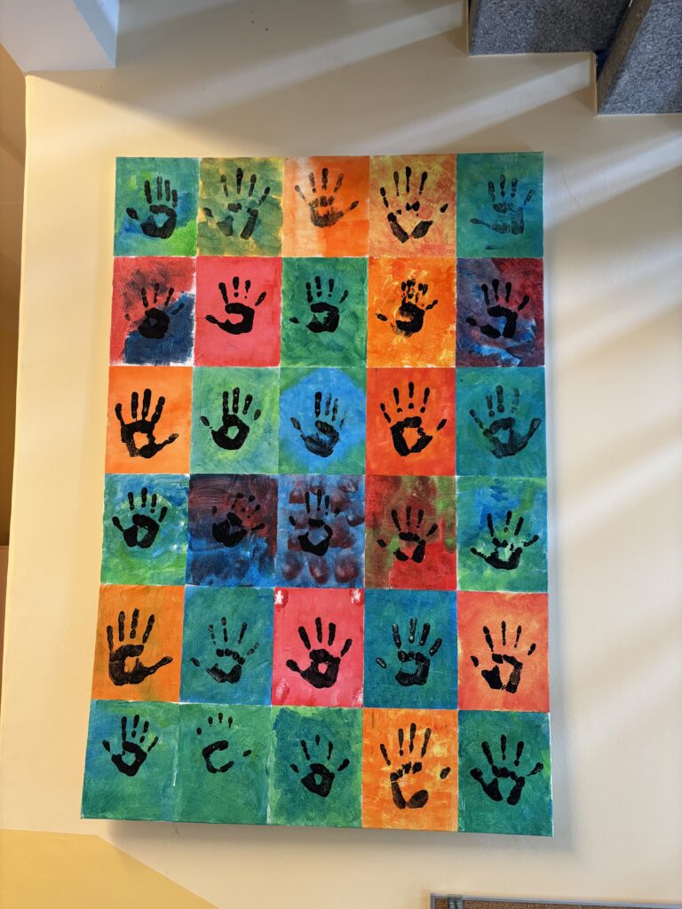 In unserer Kunstgalerie präsentieren wir die kreativen Werke unserer Schülerinnen und Schüler. Mit verschiedenen Materialien und Techniken entstehen einzigartige Zeichnungen, Bilder und Kunstprojekte. Ein besonderes Highlight ist unser Schulaufgang, der mit Leinwänden gestaltet wurde – darauf verewigten sich Kinder und das Schulpersonal mit bunten Hand- und Fußabdrücken.